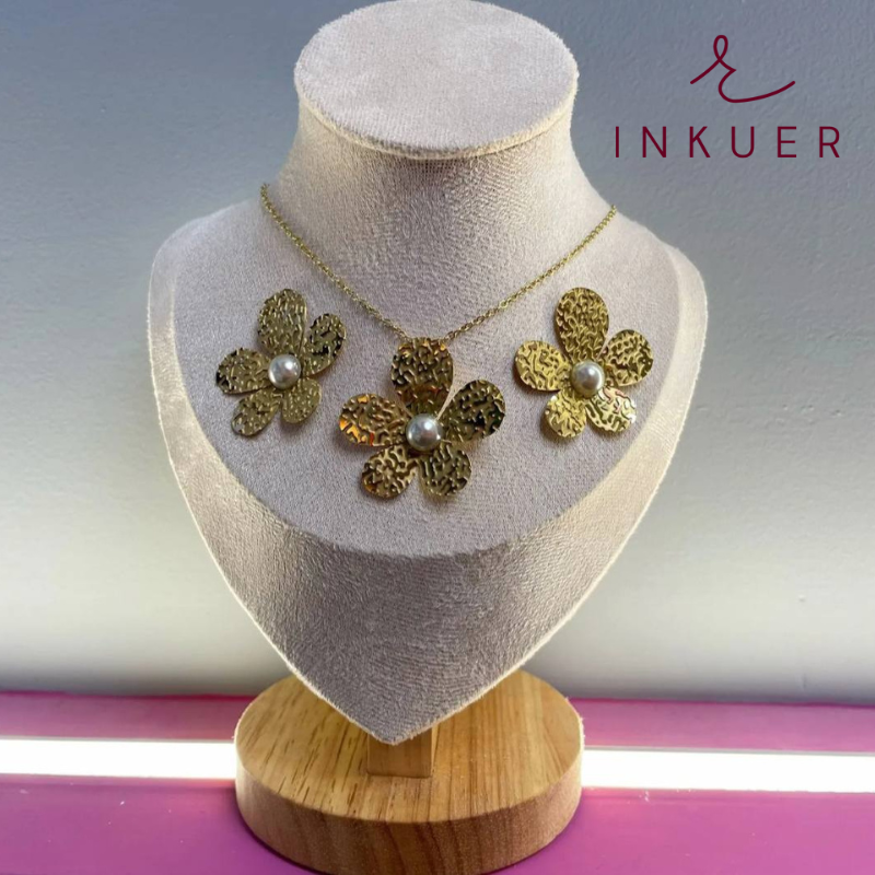 Déjate envolver por la delicadeza de la naturaleza con nuestra colección floral de INKUER. Cada pieza, elaborada en pétalos dorados y coronada con una perla central, celebra la belleza única de lo femenino: suave, fuerte y eternamente auténtica.